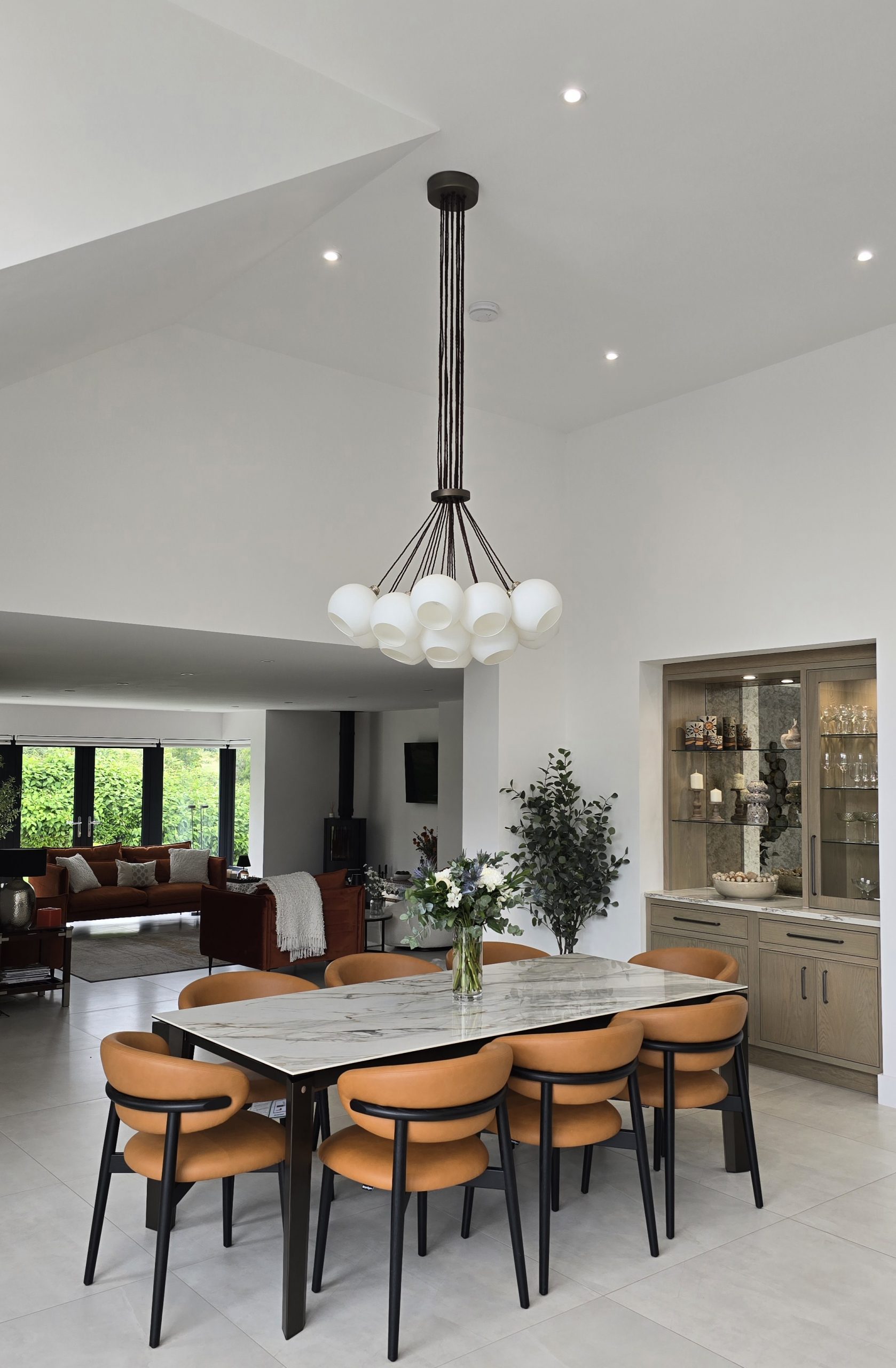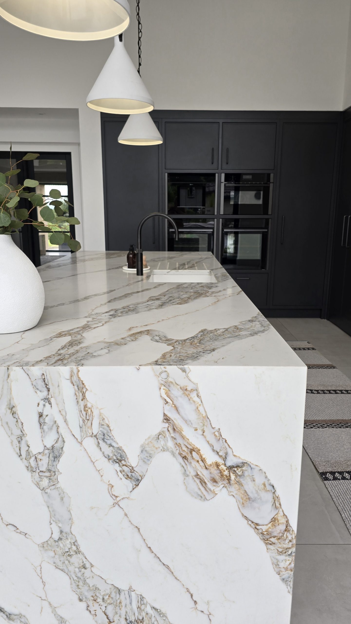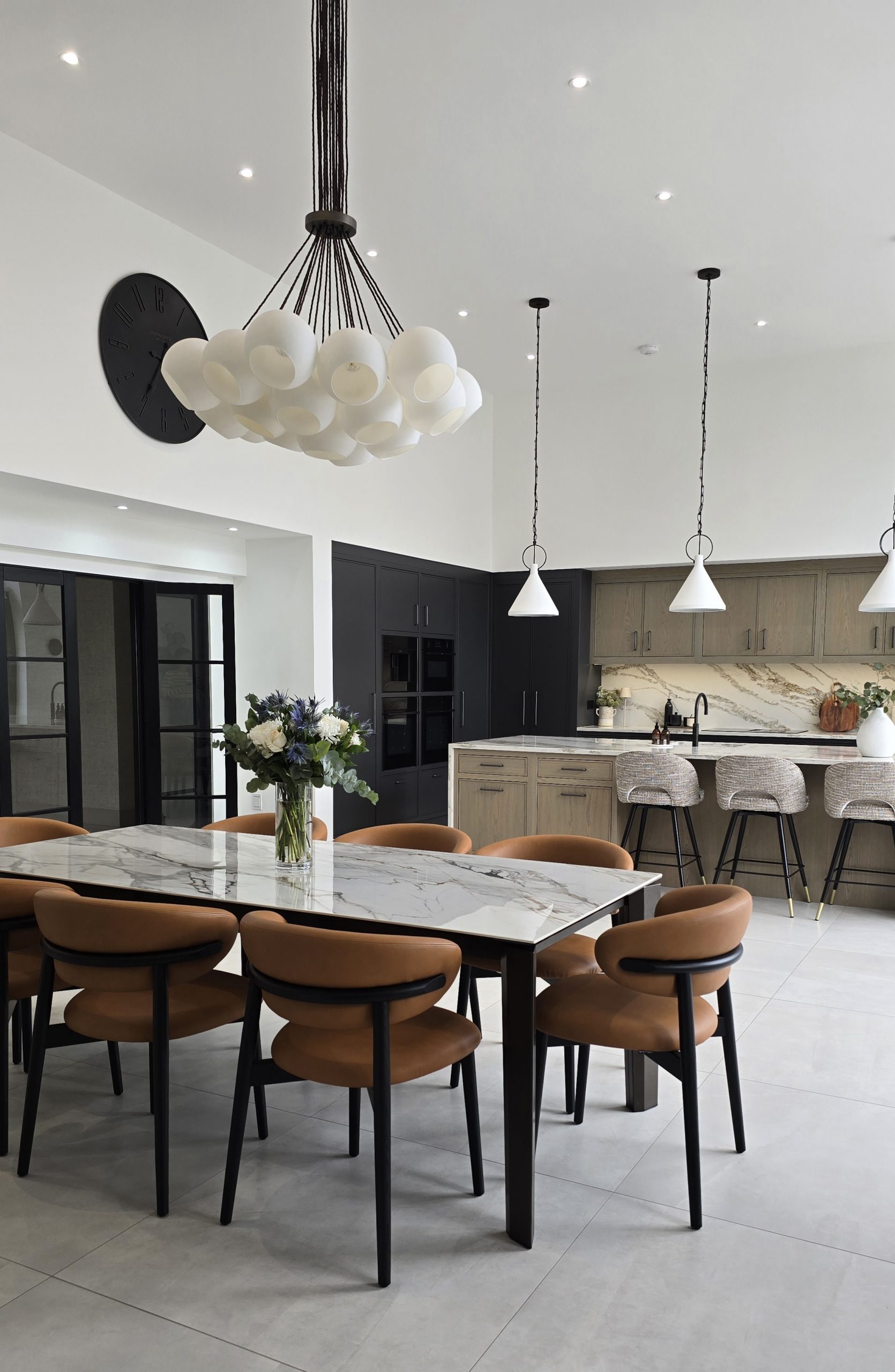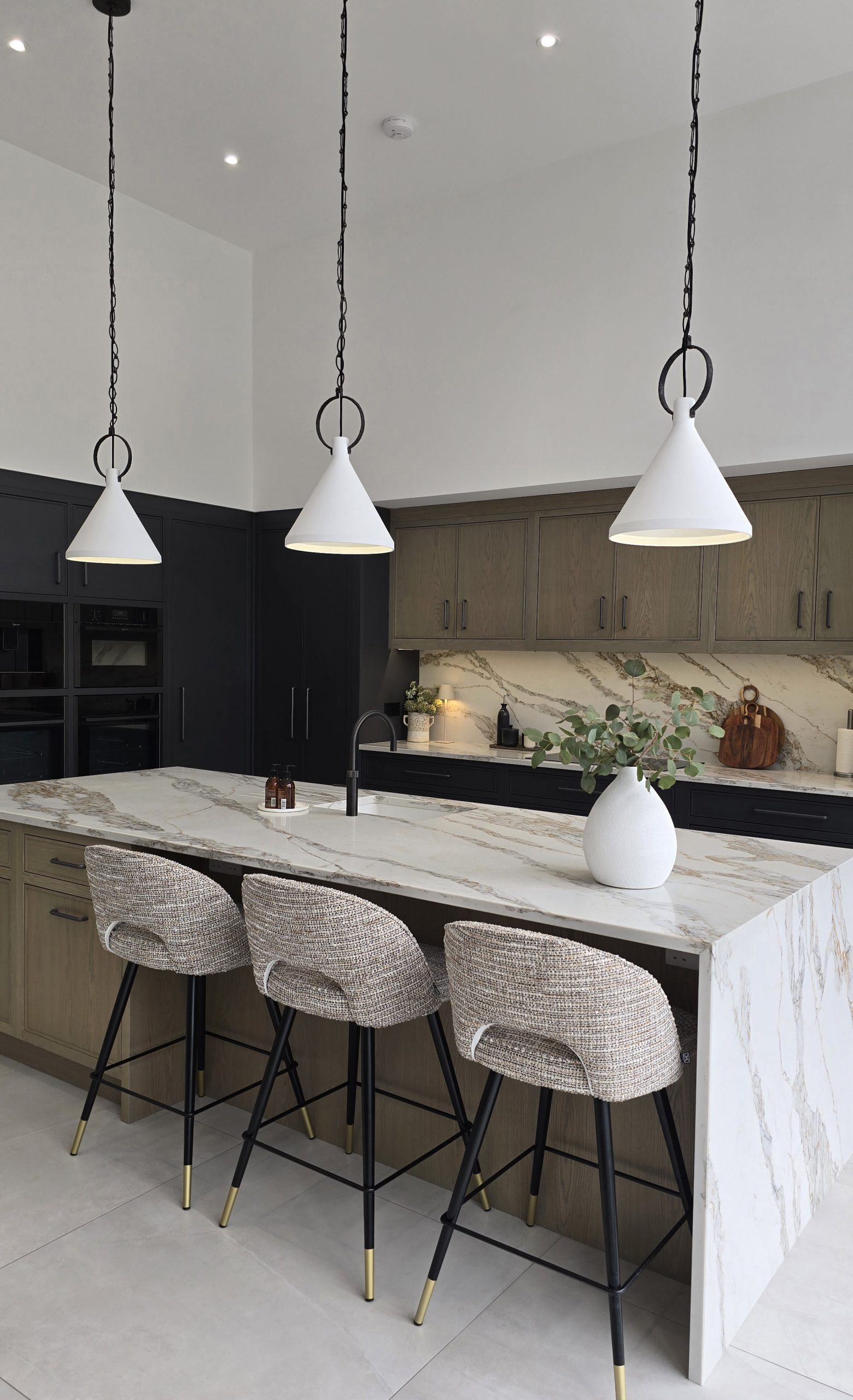 What was once an indoor swimming pool has been completely reimagined as a striking, contemporary kitchen — a dramatic transformation defined by vaulted ceilings, seamless cabinetry and an all-encompassing midnight colour palette.
