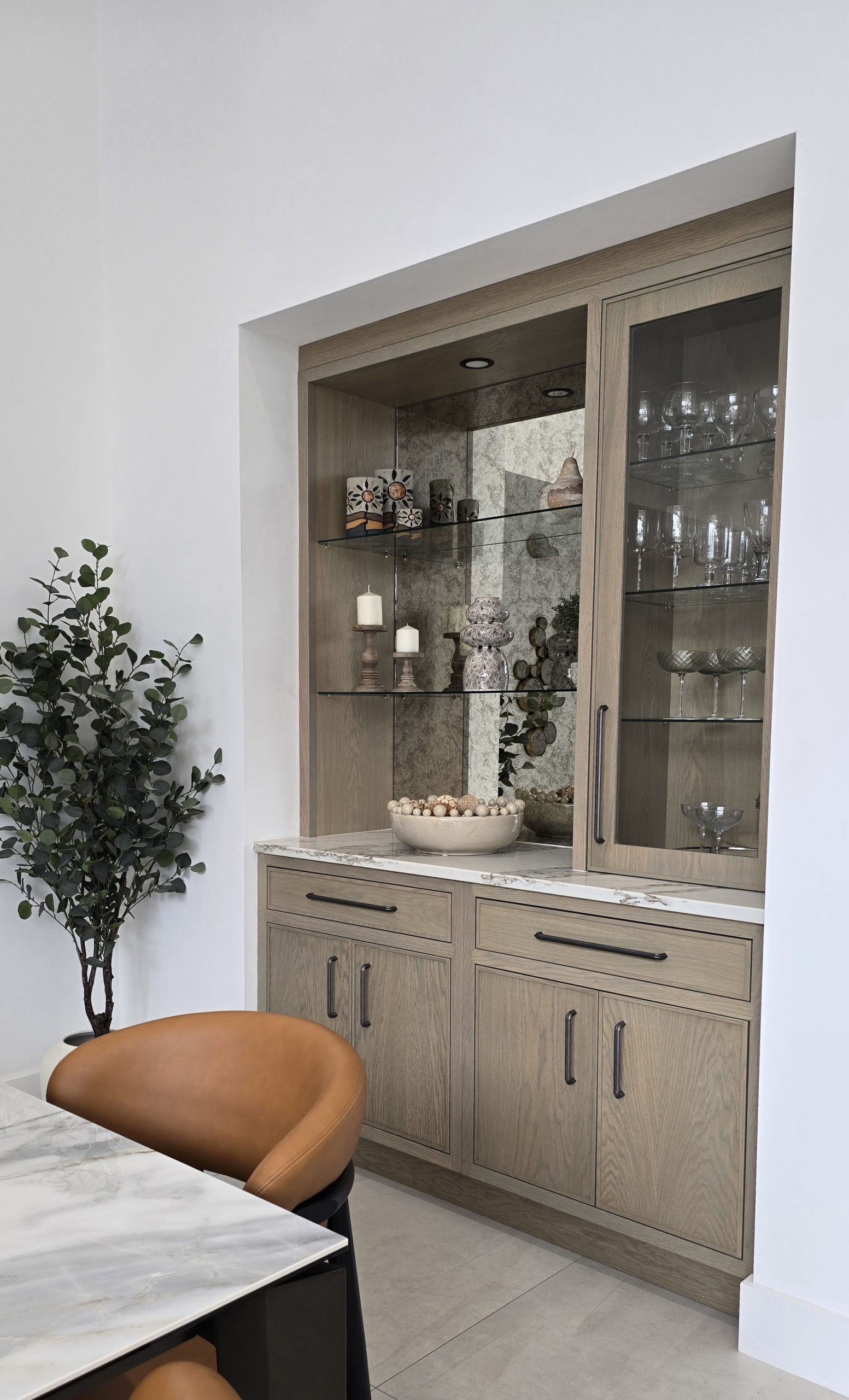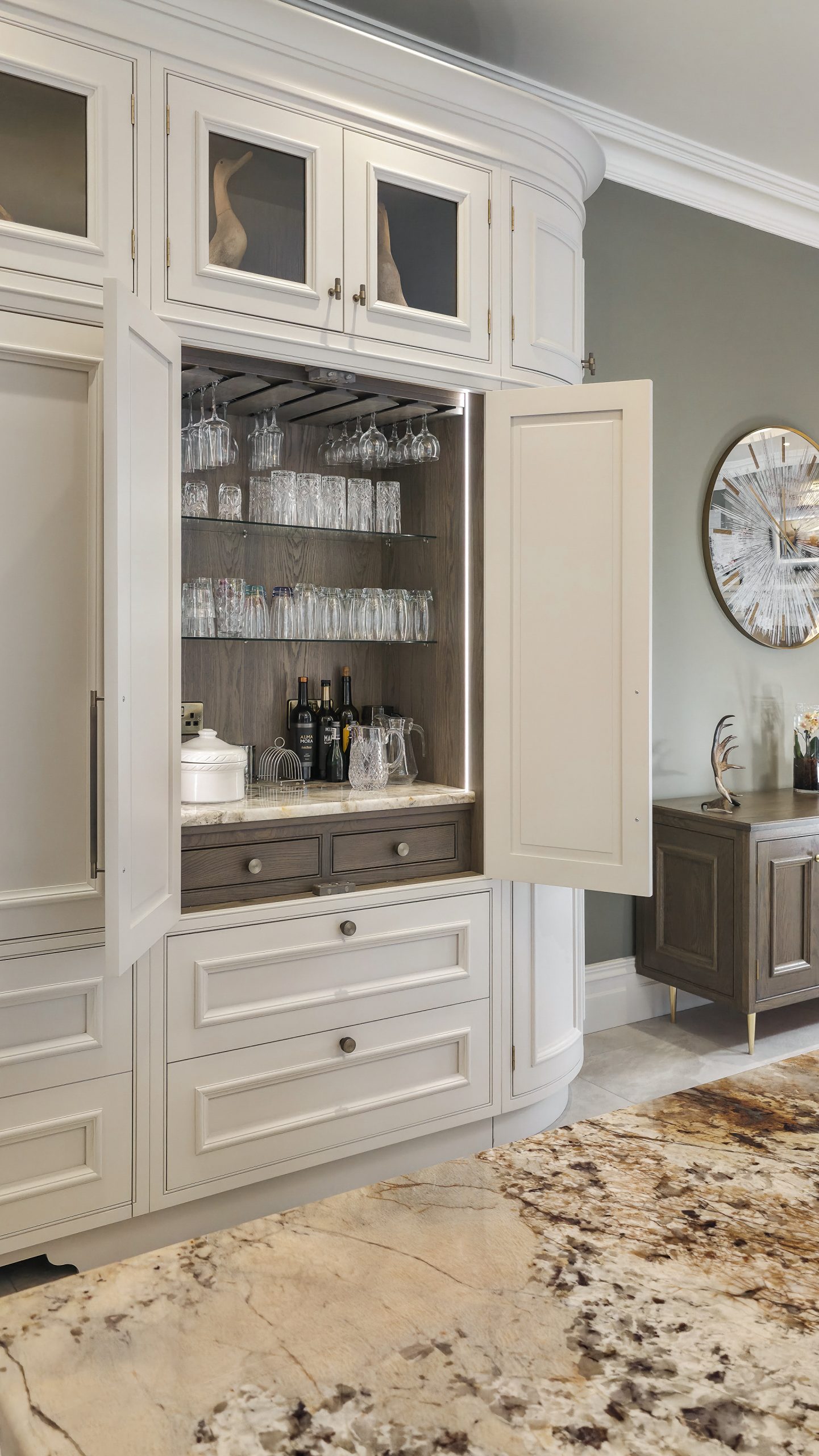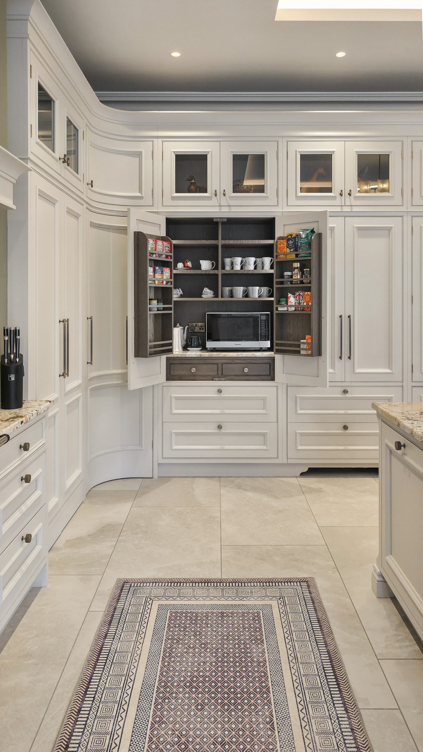Designed to disappear within the cabinetry run, the door maintains uninterrupted lines across the wall. There are no obvious frames or visual breaks — just seamless craftsmanship. Step through, however, and you’ll find a fully functional pantry space, keeping small appliances and storage neatly hidden from view.