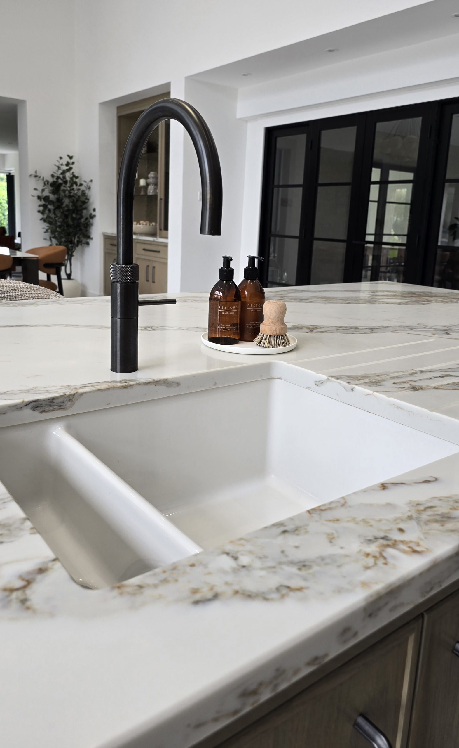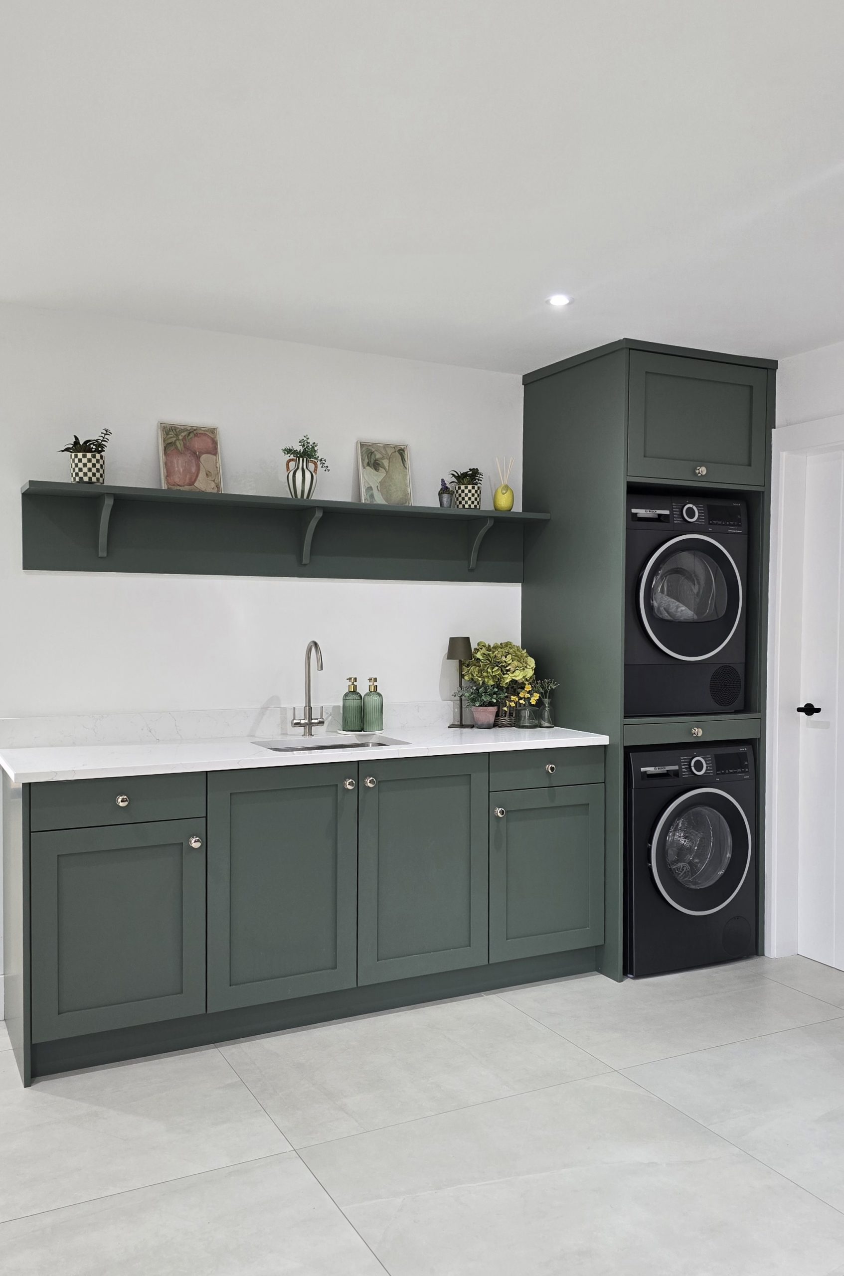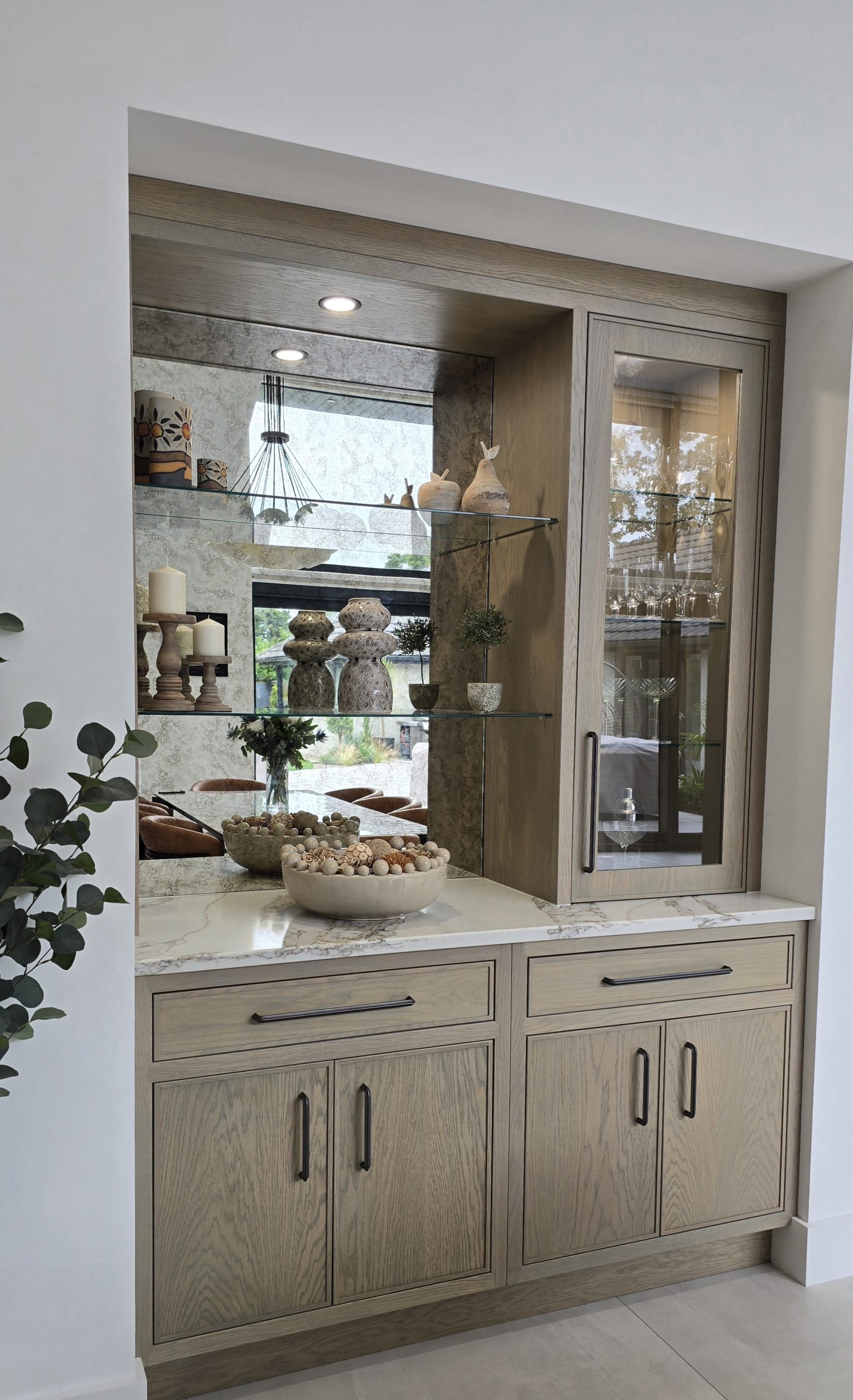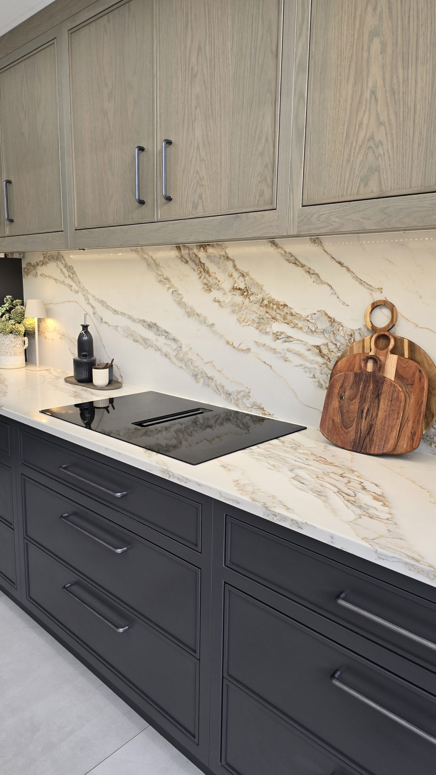 Designed to disappear within the cabinetry run, the door maintains uninterrupted lines across the wall. There are no obvious frames or visual breaks — just seamless craftsmanship. Step through, however, and you’ll find a fully functional pantry space, keeping small appliances and storage neatly hidden from view.